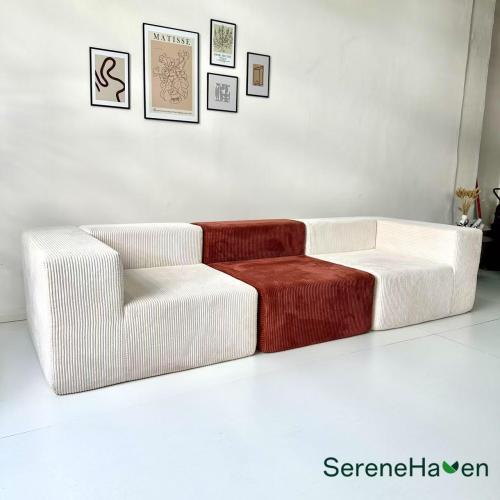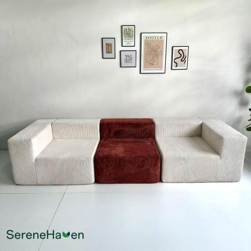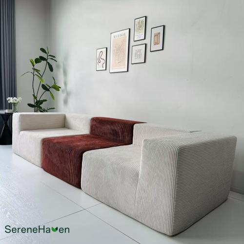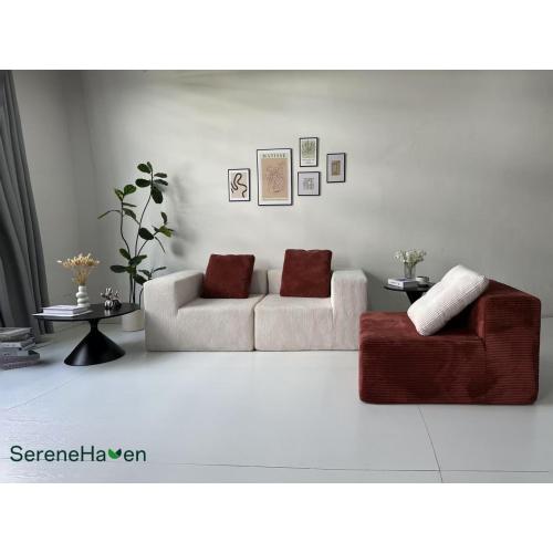 Tecnologia di compressione innovativa, facile assemblaggio Realizzato con spugna compressa ad alta densità e senza polvere, questo divano modulare a compressione arriva in un imballo compatto per una facile spedizione e movimentazione. Basta semplicemente disimballarlo e vederlo espandersi nella sua forma completa in poche ore: non è richiesto alcun assemblaggio professionale. Ideale per la logistica globale, riduce al minimo i costi di stoccaggio e trasporto garantendo al tempo stesso condizioni impeccabili all'arrivo. Design modulare per configurazioni infinite Dotato di un versatile sistema modulare, il divano SereneHaven ti consente di personalizzare i layout per adattarli a qualsiasi spazio. Mescola e abbina moduli in velluto bordeaux intenso e beige chiaro per creare sedute a forma di L, componibili o indipendenti. Perfetto per appartamenti, uffici o angoli accoglienti, si adatta alle tue esigenze in evoluzione. Tessuto in velluto premium ed estetica elegante Rivestito in morbido e resistente velluto di velluto a coste, ogni modulo unisce lusso e praticità. La ricca tavolozza di colori, dal beige sereno all'audace bordeaux, si abbina agli interni moderni. Abbinato a stampe artistiche minimaliste in bianco e nero e vegetazione delicata (come mostrato nelle immagini lifestyle), eleva qualsiasi stanza con un tocco di sofisticatezza curata. Comfort funzionale, scelta sostenibile La spugna ad alta resilienza fornisce un supporto ottimale per l'uso quotidiano, mentre il processo di produzione ecocompatibile è in linea con gli standard di sostenibilità globali. I tessuti facili da pulire e la struttura robusta garantiscono prestazioni di lunga durata, rendendolo un investimento intelligente per progetti residenziali o commerciali.- Materiale: velluto di velluto a coste + spugna compressa ad alta densità