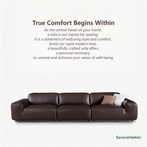 Esplora il divano SereneHaven Dacale. Questo divano in pelle di lusso è caratterizzato da pelle semi-anilina di prima qualità, una struttura in legno massello rinforzato e un'imbottitura in piuma simile a una nuvola. Progettato per durare con una garanzia di 10 anni, è ideale per il settore alberghiero, gli uffici e i progetti residenziali di fascia alta.